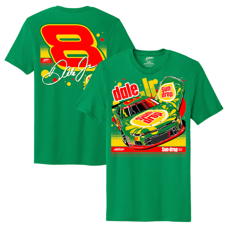 The Dale Earnhardt Jr. JR Motorsports Official Team Apparel Kelly Green Sun Drop #8 Camaro T-Shirt brings back the bold energy of a fan-favorite partnership. With its vivid color, retro soda vibes, and Dale Jr.’s iconic #8, this tee is a head-turner that hits both nostalgia and race-day style in one lap.