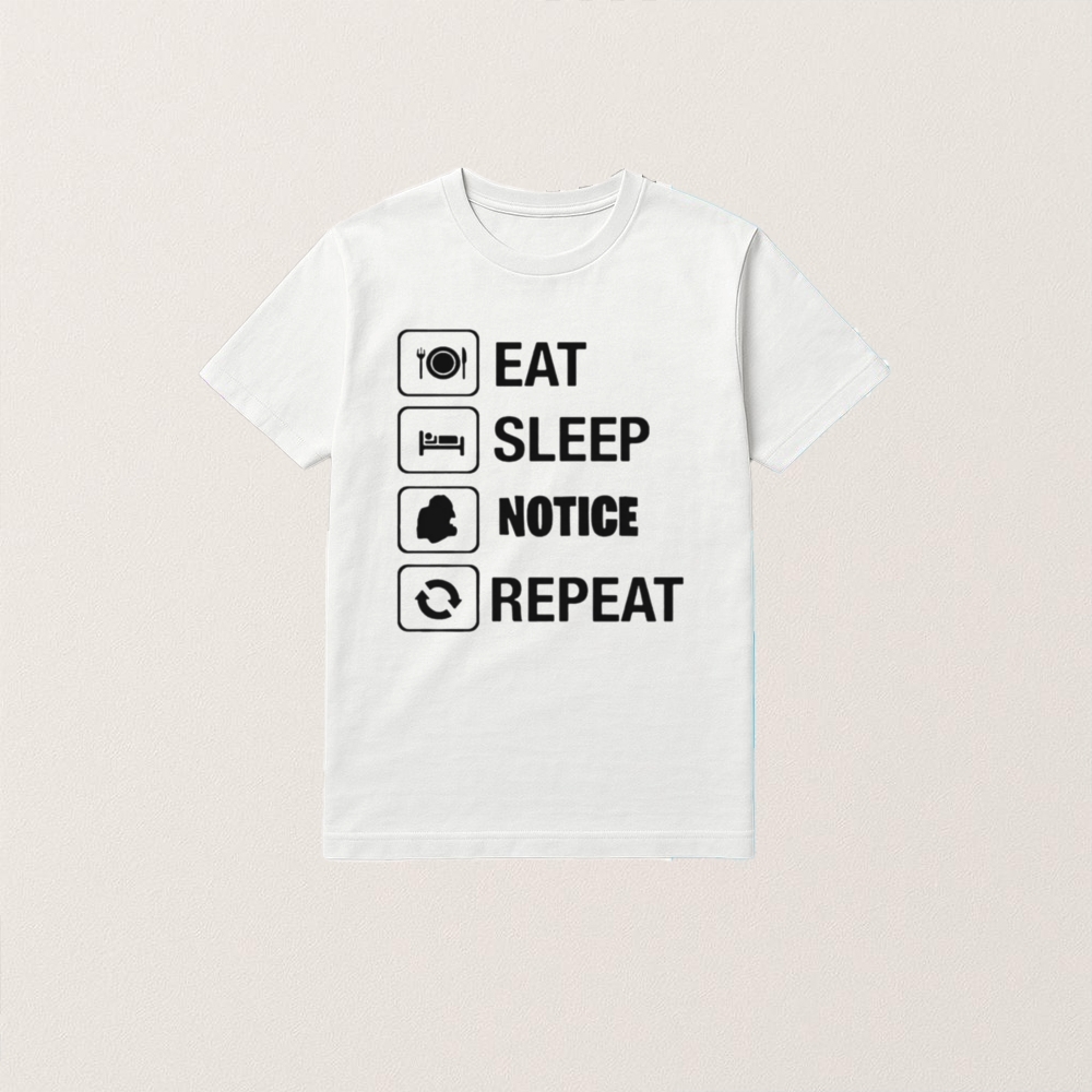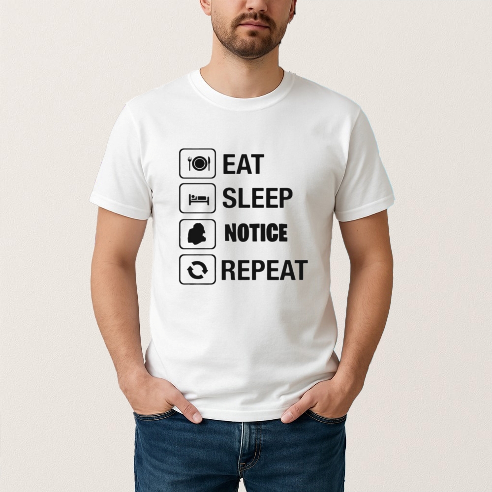The “Eat Sleep Notice Repeat” shirt exemplifies the power of apparel as a medium for expression and connection. This simple yet impactful message resonates with individuals who prioritize mindfulness and balance in their daily lives. By wearing this shirt, people not only convey their personal values but also invite others to engage in conversations about the importance of awareness and routine. It serves as a reminder to focus on the present moment, encouraging a lifestyle that values observation and reflection. As a cultural artifact, this apparel piece transcends mere fashion, fostering a community of like-minded individuals who appreciate the significance of living intentionally.